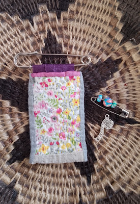 It's early on Sunday afternoon and I'm all caught up with The Archers, along with several political podcasts, not that either are filling me with much joy at the moment. Anyhow, I thought I'd show you how this heart shaped sewing case turned out. If you recall from my last post, it's based on a pattern by StitchWitch, picked up in a charity shop for 50p. First off, I'll say I'm impressed by anyone who tackles the tricky art of writing instructions. They're not easy to do, and on the whole these are pretty good. This is the sewing case closed up, with a button and ribbon loop fastening. Here is it opened out. There's a pocket at the top, and on the left is a section for storing scissors in. The original design has fabric strips glued in, intended to push your needles & pins into. I substituted a flat rectangle of pale brown felt, blanket stitched into place. My small Fiskars scissors aren't quite small enough to neatly fit inside, and I think it'd work better if I'd included a couple of felt pages rather than a piece of sewn-down felt to act as a kind of needlebook. But the main problem encountered was with the fabric 'hinges' joining the hearts together. I could easily insert them between the straight edges of the half-hearts, but not position them properly around the curved edges of the whole hearts. So I ended up stitching those curved edges together, which worked just as well. I reckon I'd make this sewing case again, but with the emphasis on stitching rather than gluing sections together, and using a heart template that has straight sides instead of these curved sides. The other thing I've been messing with is trying to make a Jessie Chorley style charm brooch. This is my second attempt - not yet finished - and it's better than my first go. I think I was previously trying too hard to recreate one of her brooches, rather than going for something that was more 'me'. I've ordered a mixed bag of Tibetan silver charms off eBay, so will wait for those and choose one that looks good. Add some beading too, and maybe patch on another mini piece of fabric. It's fun to sew on a small scale, getting the balance right between adding too much detail and adding too little.